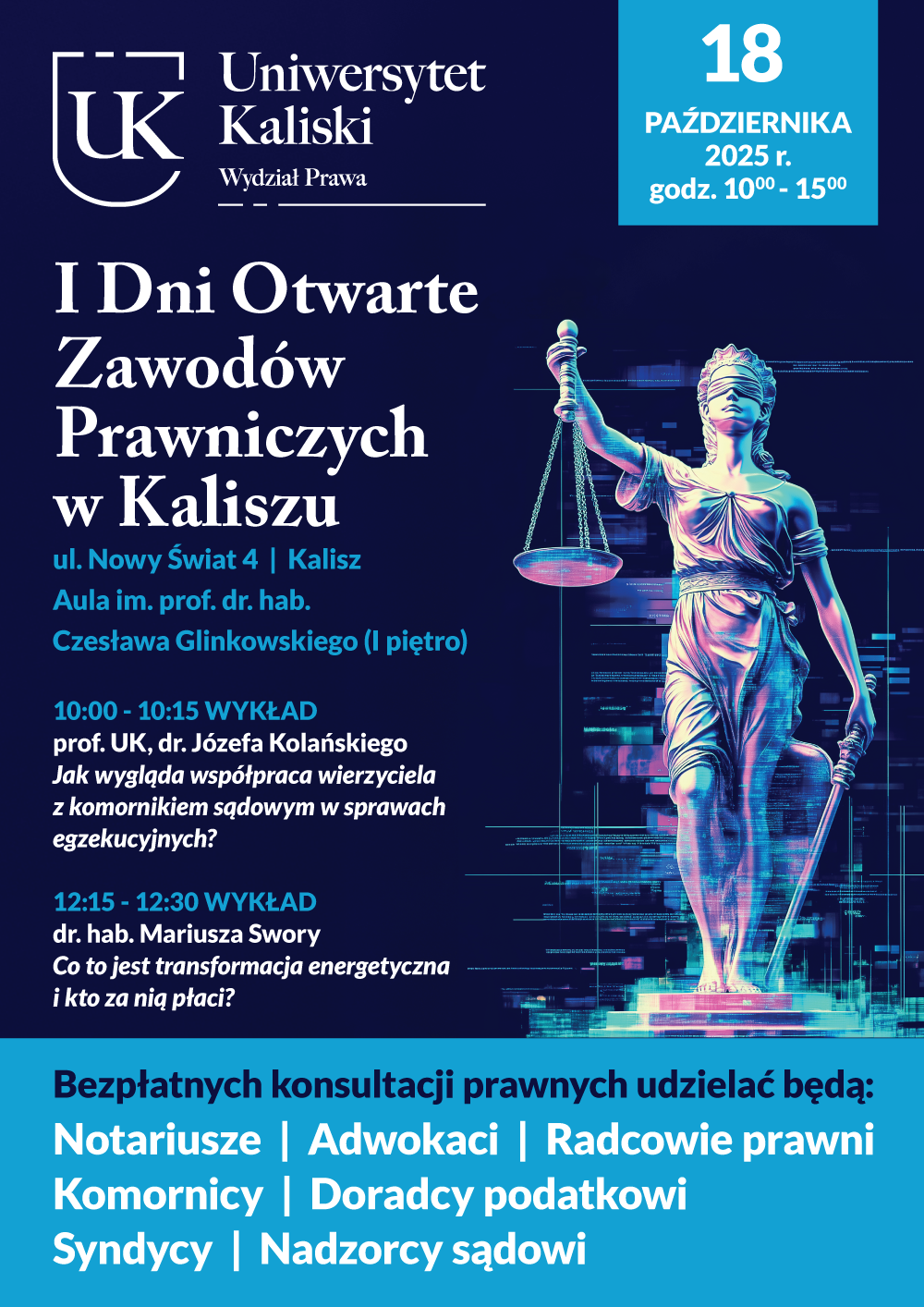 W ramach Dni Otwartych, uruchomiliśmy specjalną inicjatywę: bezpłatne konsultacje prawne. Oferujemy profesjonalną, poufną pomoc. Możecie skorzystać z konsultacji w zakresie prawa cywilnego, karnego, administracyjnego, podatkowego czy pracy – wszystko za darmo, bez zobowiązań. To nie tylko okazja do rozwiązania bieżących spraw, ale też szansa, by zobaczyć, jak teoria ożywa w praktyce.