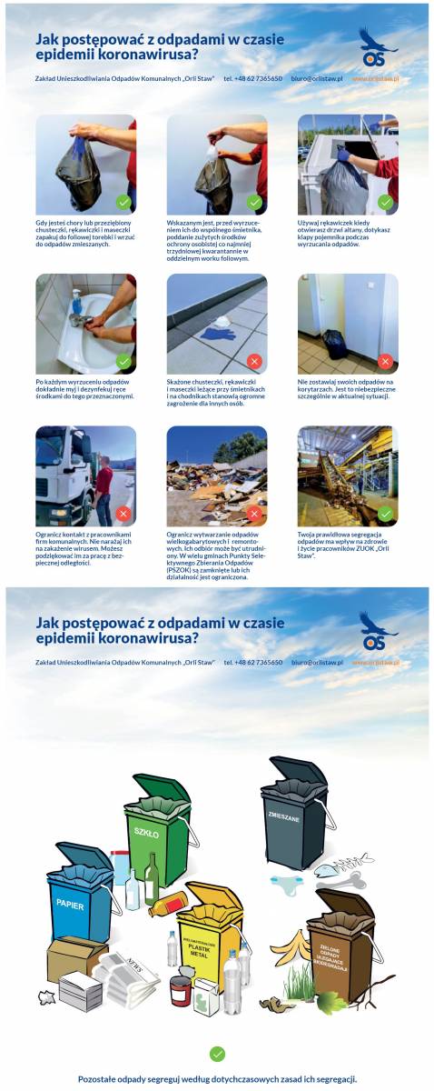 Wszyscy musimy pamiętać, że postępując zgodnie z ww. zasadami dbamy o zdrowie swoje, swoich najbliższych oraz obsługujących nas pracowników z branży komunalnej. Oprócz służby zdrowia i innych służb bezpośrednio ratujących nasze życie, sprawne działanie branży odpadowej, jest kolejnym bardzo ważnym ogniwem naszego bezpieczeństwa w zakresie ochrony naszego zdrowia i życia. Jeżeli oni nie będą mogli odebrać naszych odpadów, przepełnione śmietniki będą stanowiły dla każdego z nas olbrzymi problem sanitarny. Kluczowym elementem systemu gospodarki odpadami na terenie gmin należących do Związku Komunalnego Gmin „ Czyste Miasto, Czysta Gmina” jest Zakład Unieszkodliwiania Odpadów Komunalnych w Orlim Stawie (www.orlistaw.pl). Czasowe zamknięcie lub ograniczenie pracy Zakładu może spowodować olbrzymie zagrożenie dla wszystkich członków naszej społeczności.