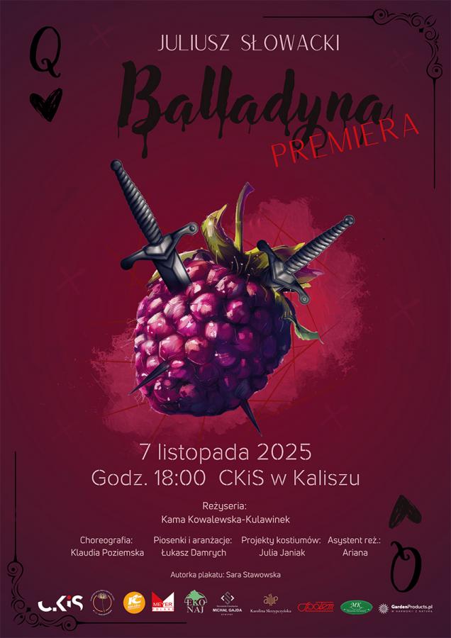 W Centrum Kultury i Sztuki w Kaliszu 7 listopada odbędzie się spektakl Balladyna w nowej, dynamicznej odsłonie. Obok 26 młodych aktorów, również widzowie będą mogli aktywnie uczestniczyć w przedstawieniu. Reżyserka podkreśla, że jest to projekt wymagający dużej koncentracji i energii. Spektakl, mający wymiar edukacyjny, ma pomóc widzom w zrozumieniu treści dramatu. Bilety na wydarzenie kosztują 40 zł.