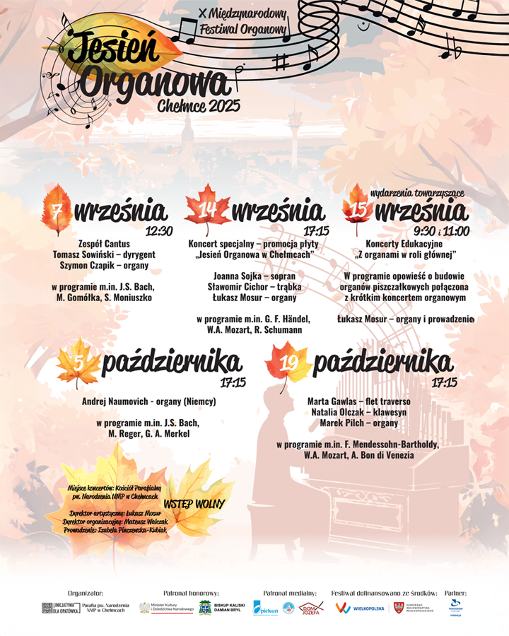 Zapraszamy do obejrzenia galerii zdjęć z festiwalu muzyki organowej w Chełmcach. Zobacz, jak artyści zachwycali wykonaniami utworów J.S. Bacha i innych kompozytorów, jak wyglądały koncerty Cantus z Leszna oraz jak przebiegały koncerty edukacyjne Z organami w roli głównej. Przekonaj się, dlaczego to wydarzenie zyskało patronat Biskupa Kaliskiego Damiana Bryla i Ministra Kultury. Poznaj atmosferę wyjątkowych koncertów i dołącz do nas online lub osobiście!