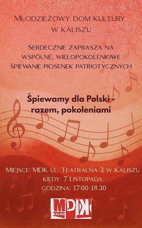 W Młodzieżowym Domu Kultury odbędzie się wyjątkowy koncert przed Narodowym Świętem Niepodległości. Przy odzyskiwaniu suwerenności przez Polskę 107 lat temu, wspólnie będziemy śpiewać pieśni, które dawały nadzieję i odwagę w trudnych czasach. Przeżyjmy emocje i historię razem przez melodie, które łączą pokolenia. Przyjdź 7 listopada o godz. 17.00, zatop się w dźwiękach, które budują wspólnotę i przypominają o najcenniejszym dziedzictwie - byciu razem. Wstęp wolny.